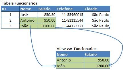 O Script cria a tabela Funcionarios com algumas informações (ID, Nome, Salário, Telefone e Cidade) e, em seguida, são inseridos alguns registros. Logo após, uma view (vw_Funcionarios) é criada. A grosso modo, podemos dizer que Views são tabelas virtuais definidas por uma consulta T-SQL. A nossa view, criada na Listagem 1, retorna o nome e o salário de todos os funcionários que ganham mais de R$ 900,00.