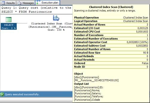 Com base na estrutura da tabela Funcionarios, podemos verificar na Figura 4 que para o comando SELECT * FROM Funcionarios, o Query Optimizer gerou um plano de execução que acessa a tabela Funcionarios utilizando o operador Clustered Index Scan.
