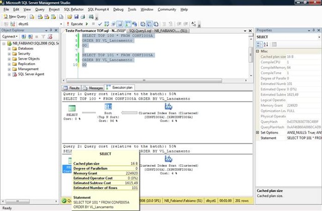Veja que para o primeiro plano de execução(TOP 100) o SQL Server reservou 1024 kb de memória, e para no segundo plano(TOP 101) ele reservou 224920 kbs de memória.
