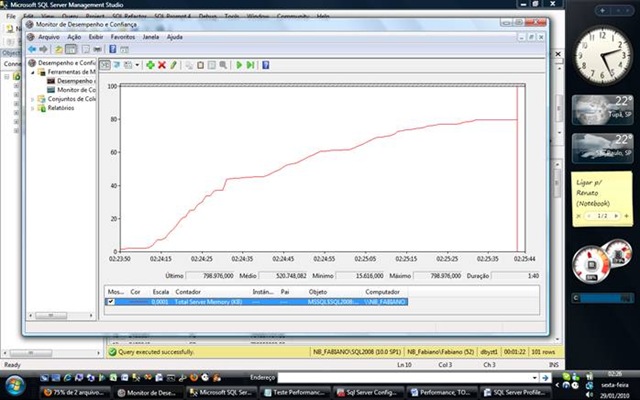 Veja o gráfico de memória utilizada pelo SQL Server ao rodar a primeira consulta. Repare que o SQL utilizou 553mb de memória e rodou a consulta em 44 segundos(veja no SSMS atrás do PerfMon).
