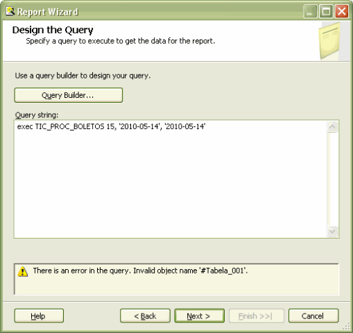 Ao tentar utilizar uma proc que usa uma tabela temporária, o Wizard retornava uma mensagem de erro dizendo que a tabela não existia, segue o print abaixo.