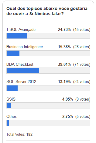 Como vocês podem ver, e para minha surpresa a WebCast sobre DBA CheckList foi a grande campeã com 39% dos votos, seguido do tema relacionado a T-SQL Avançado com 24%. Digo que fiquei surpreso porque sempre achei que o público do meu blog era maior por parte dos desenvolvedores e não de DBAs…